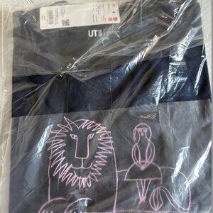 Bring art and comfort together with this charming Lisa Larson x UNIQLO “Peace For All” graphic T-shirt. Featuring a peaceful pink line illustration of a lion and woman with the message “Trust in Peace,” this design blends creativity and calm in one modern piece. Made from soft 100% cotton in a deep navy blue, this tee offers a relaxed unisex fit and is part of UNIQLO’s special artist collaboration line. It’s lightweight, breathable, and perfect for everyday wear or pairing with your favorite jeans, joggers, or layered under a jacket.