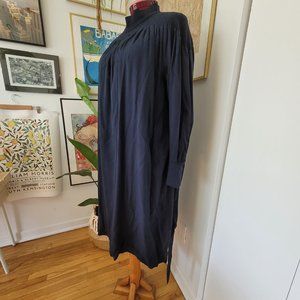 This beautiful midi length dress in dark blue offers a belted or unbelted waist, elastic smocked yoke and collar and button cuffs. The dress has pockets and total length from neck to hem is 44” – it should sit mid calf.
