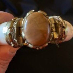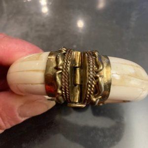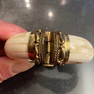 An extraordinary find! Ivory look cuff with antique finish hardware and black or tan center stone. Back closure is shown. Wrist opening 2 1/4 inch approx. I have never seen any like them, but they don't fit anymore! Buy the set for price shown, or sold separately at $40 each