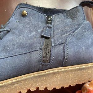 .Dark blue suede chukka style boots. Zara kids size 39 sign on rubber outsole .Side zipper.good condition,good name, good quality.They look more like ladies boots, size US 8.(my opinion).