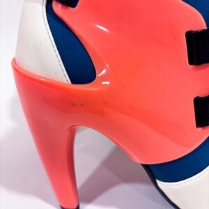 Striking UNITED NUDE sculptural heel booties in a bold cream, orange, and navy colorblock design. This signature architectural style features the brand’s iconic geometric heel, creating a modern Avant Garde statement piece perfect for collectors and fashion-forward wardrobes.