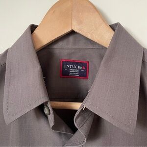 UNTuckit Wrinkle-Free Sangiovese Shirt Grey Size Medium. Say hello to your newest, versatile button-down. The classic Wrinkle-Free Sangiovese Shirt features a snappy Stay-Put Collar and a solid gray color that's both sharp and perfectly understated. Plus, our signature sail logo in navy blue gives this shirt an extra visual pop, and the perfect untucked length always fits right. Layer it under a lightweight vest for a laid-back weekend look, or dress it up with one of our suave Sport Coats for more formal events. Still on website for $135. Excellent condition. Pit to pit: 22" Shoulder: 19" Length: 27" Sleeve from armpit: 22"