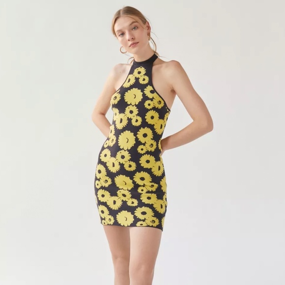 Brand new with tags Urban Outfitters knit high-neck mini dress in a fun black and yellow graphic sunflower print. Thick, soft and stretchy fabric with a sleeveless mockneck neckline and a bodycon fit.