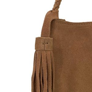 Rustic suede pouch bag flanked with long fringe and braided shoulder strap. Two card slots and small compartment, just enough room for your essentials.