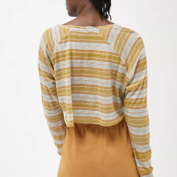 UO Out From Under Alora stripe cropped long sleeve tee new with tags. 100% cotton, relaxed oversized fit, crew neck, mustard/cream/khaki shades stripes. Marked size L. All measurements are approximate and taken with the garment laying flat: Armpit to armpit 25’’ Total length 15". This item comes from a smoke free, pets friendly home. Recycled bags/box used when possible. Please, let me know if you'd like any additional info. Thanks for watching!