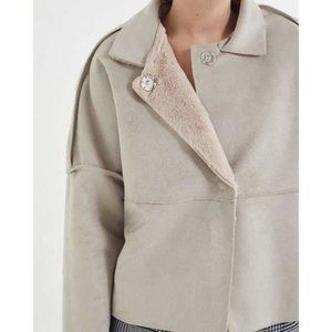 hey! im selling my reversible faux fur jacket from urban. oh the versatility! it’s v oversized and cropped with a faux suede finish on one side, and super soft faux fur on the other. it’s like a warm hug! relaxed fit, boxy silhouette, hidden snap button enclosure with dropped long sleeves.