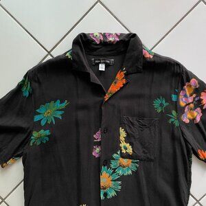 Lightweight, flowy, and full of character — this Urban Outfitters short-sleeve button-down features a striking floral scatter print on a black rayon base. The colors still pop beautifully — bold turquoise, orange, and magenta blooms give it an effortless summer vibe.