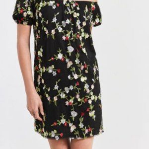 from urban outfitters! lovely dress and material -- the inside layer is silky and there's a sort of tulle embroidered fabric layered over it?