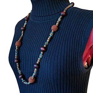 URANIUM - Wood Long Strand Beaded necklace - brown & aqua accent - 36 inches