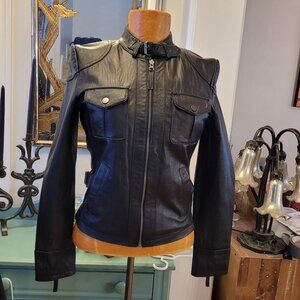 UB "Sexy Modern Edgy Generation" mint condition, black leather moto jacket with leather patches at the shoulders and elbows, breast pockets, side pockets, and zipper closure, as well as zippers at the end of the sleeves.