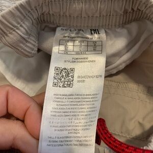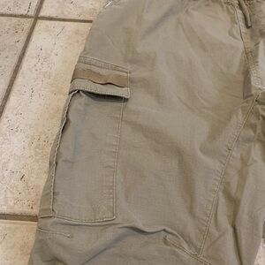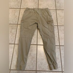 These are a pair of men's cargo jogger pants from Urban Heritage. They are a size large with a "Regular Fit". The color is a versatile tan/khaki, and they feature an elastic waistband with a drawstring, along with elastic cuffs at the ankles. There are two side pockets and two cargo pockets, one on each leg. The pants are made in Bangladesh. Gently used condition.