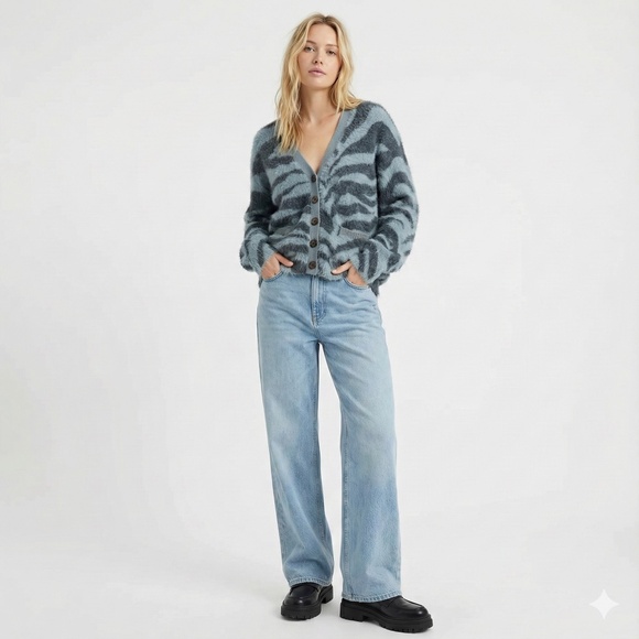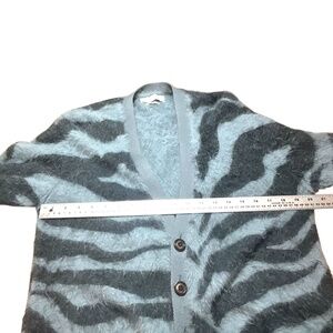URBAN OUTFITTERS Fuzzy Tiger Print Button Front Cardigan Denim Blue & Charcoal L