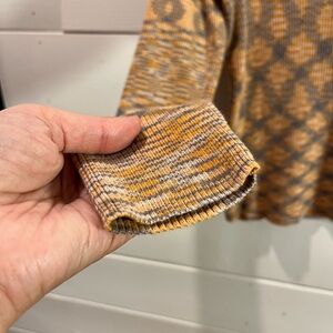 Lightweight long-sleeve turtleneck in a striking orange and grey geometric pattern. Soft, ribbed stretch fabric, perfect for layering or wearing on its own. Never worn, without tags.