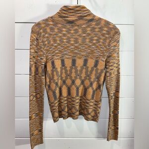 Lightweight long-sleeve turtleneck in a striking orange and grey geometric pattern. Soft, ribbed stretch fabric, perfect for layering or wearing on its own. Never worn, without tags.
