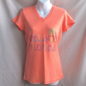 US Apparel Orlando, Florida tee. Lightweight, bright orange and very summery! Small faded spot on left sleeve but hardly noticeable (photo 7).