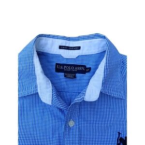 Elevate your casual wardrobe with this U.S. Polo Assn. blue and white checkered button down shirt, featuring a tailored fit and classic collar. Made from lightweight material, it ensures comfort and style for any casual occasion. The subtle chest logo adds a touch of elegance to your ensemble.