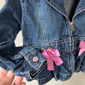 US. Polo Assn. denim Jean jacket. Adorable cut of the collar, zipper front, pink bows on the front, pink embroidery accents, and a cheetah print heart.