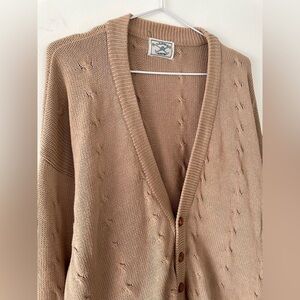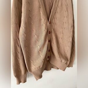 Lovely tan knit oversized mid-weight cardigan with knit cable details. Good vintage condition with some minor pilling and a few small pulls. Cozy cottagecore layer. No fabric tag, no size tag, appears to fit women's oversized/large|extra large, please refer to measurements.