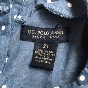 "It was an itsy bitsy teeny weeny navy polka dot dress" - sing with me! lol. All kidding aside, this US Polo Assn dress, size 2T, is really sweet. Navy blue with polka dots and a a pink US Polo Assn logo on the fron. Buttons up at the back.
