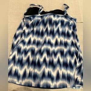 Discover the elegance of the Miraclesuit camisole, featuring a striking asymmetrical cut and stylish cut-out details. This sleeveless top combines the classic colors of blue and white, offering a chic and modern look. Perfect for adding a touch of sophistication to any outfit.