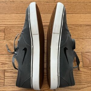 Experience the perfect blend of style and comfort with these Nike gray sneakers. Featuring a low-top design and crafted from a suede-like material, these shoes offer a soft, matte finish. The white soles provide a striking contrast, making them ideal for any casual outing.