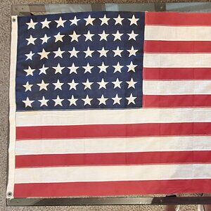 Vintage USA Flag with 48 Stars. I believe it’s made from wool bunting. No signs of mildew, but a few stains from being folded. Found in wall of house built in 1912. Relatively very good condition with perfect stitching.