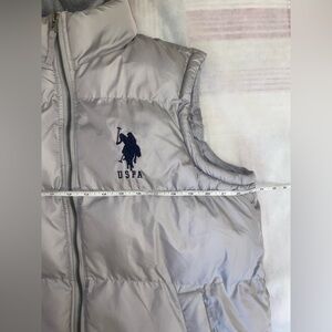 Stylish gray puffer vest with a hood. Features USPA logo on the chest.