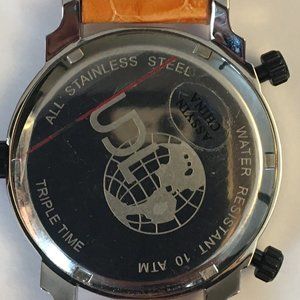 Interesting UTD Unisex-sport watch-orange leather strap with 1.5 inch black round face. Triple time feature. Water Resistant to 10 ATM.
