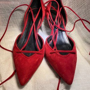 Gorgeous red suede tie-up pumps from Uterque, size 39, heel measures approx. 3". In excellent pre-owned condition.