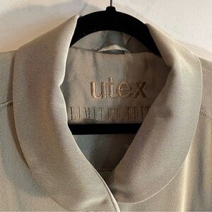 UTEX LIMITED EDITION Sz 12 Trench Coat Turned Collar Shoulder Pads Back Slit. Gorgeous vanilla girl capsule wardrobe boogie beige aesthetic. Missing button at slit back. Easy fix. Does not show when wearing. Lovely texture and drape to the fabric. Sophisticated. Classic. Slightly oversized.