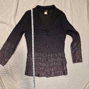 Textured UbU lightweight jacket/cardigan with button front and tailored collar. Unique crinkled fabric detail, artistic and travel-friendly. Great pre-owned condition.