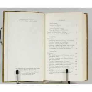 This is a vintage copy of Uber den Umgang mit Menschen by Von Knigge, published by Deutsch Buch-Gemeinschaft in 1964. It is a marbled hardcover book with a tan leather hobbed spine and gilt lettering on both cover and spine. There is an attached white ribbon book mark.