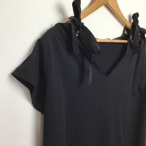 This Uchuu Montreal black ribbon tunic dress blends minimalist elegance with a modern twist. Crafted from lightweight fabric, it features a sleeveless oversized cut, flattering V-neckline, and chic ribbon tie accents at the shoulders for a subtle statement detail.