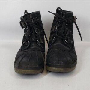 Black leather ankle boot. Waterproof. Lace up close with side Adjustable buckle strap