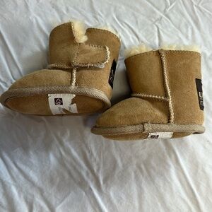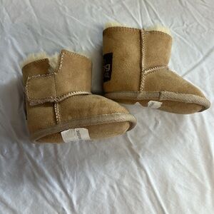 Cozy tan shearling boots perfect for cooler days. Size Velcro closure for easy dressing.