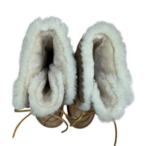 Warm and stylish UGG boots. Brown suede with white fur trim. Perfect for winter wear.