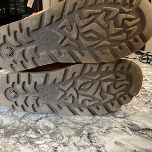 Ugg boots size 8 in EUC have always been sprayed, shearling through the whole inside the leather is very thick. Thèse were a pretty penny but were well worth the price . Not your cheap thin shearling very thick hold their shape trust me won’t rip. Wear them rolled or straight up to show the design on the back of the boot. Has reinforced leather on front of toes. Haven’t worn them in 2 years .