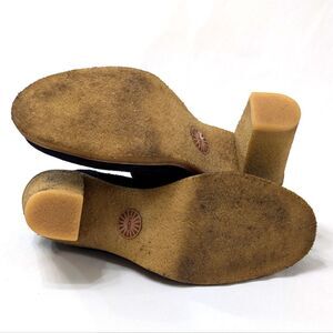 Rubber sole & heel, black suede upper, shearling interior, adjustable ankle strap. Light wear with no imperfections.