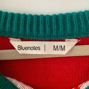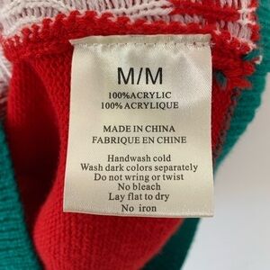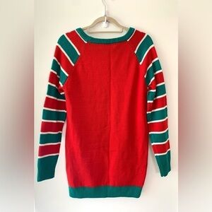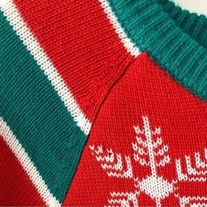Festive red sweater with green and white accents. Features holiday-themed design with text and snowflakes. Perfect for Christmas celebrations.