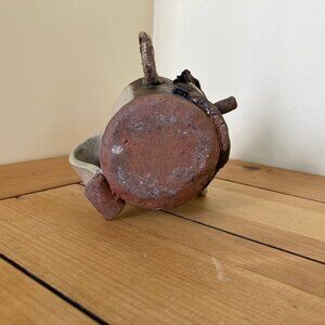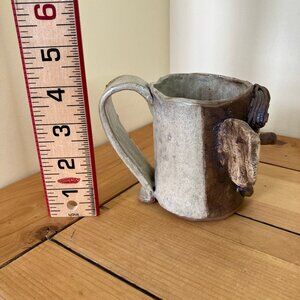 Hand sculpted ugly face mug has protruding ears & nose with large teeth. Approx. 4" tall x 5 1/2" including face & handle x 2 3/4" across top rim. Holds approx. 8 oz. Hand made, pre-owned, condition: has a few spots in the bottom of mug that are un-glazed, small chip to bottom handle edge. See photos.