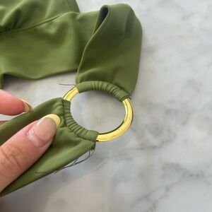Elegant forest green bikini with halter top. Features gold ring details. Ideal for beach outings.