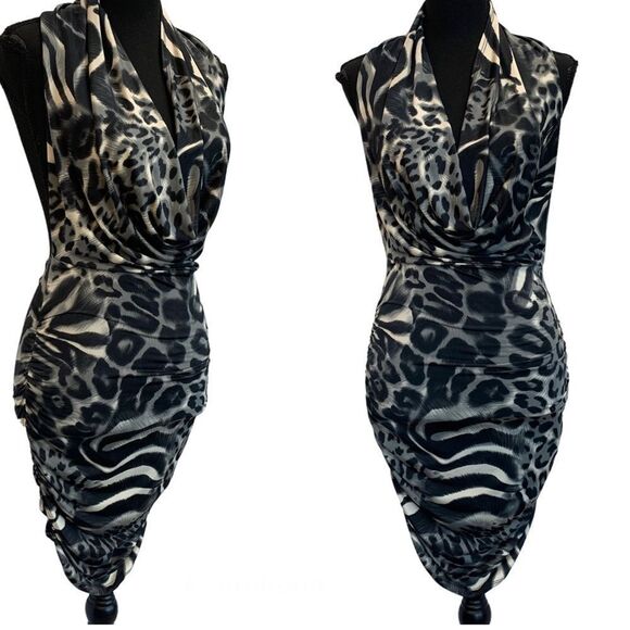 UK2LA gray black white leopard cheetah halter top bodycon mini dress open back S