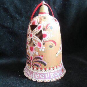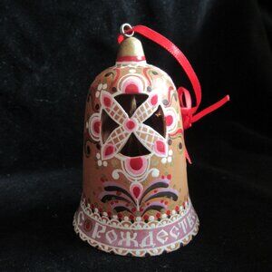 Hand crafted and painted Ukrainian Christmas bell ornament, featuring the traditional Petrykivka painting style.