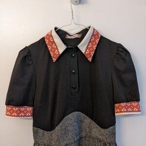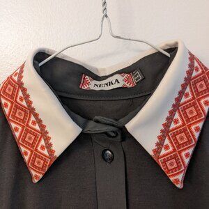 Has button closure at the front and metal zipper on the back; faux embroidery on the collar and sleeves.