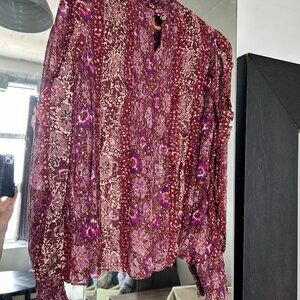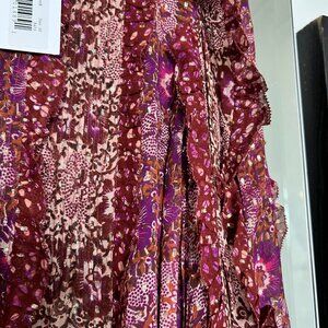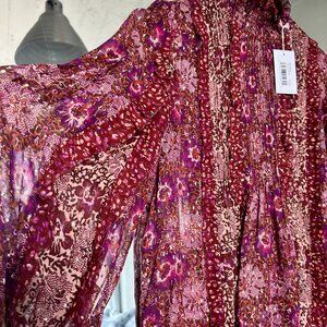 93% silk, 7% lurex. Dry clean only. Back button closure. Smocked mockneck and cuffs. Ruffle detail throughout. Imported.
