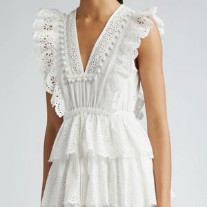 Ulla Johnson, Lilith Dress is made from airy water-washed poplin that’s adorned with geometric eyelets throughout. Sleeveless, lace neckline, tiered mini length skirt. In very good pre-owned condition.