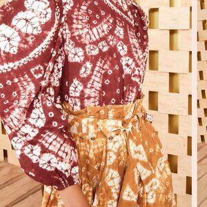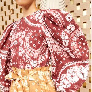 The Eliza Blouse returns this season as an Ulla Johnson exclusive, made in our hand-tied shibori, a fabric created through a time-intensive process that creates an intricate array of shapes across the material. This beautiful blouse features voluminous long sleeves, a simple neckline, and loose-fitting bodice. This piece is an Ulla Johnson exclusive.