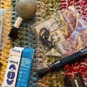 Complete camera accessory kit by Ultimaxx. Includes tripod, cleaning tools, and cables. Ideal for photography enthusiasts. Card readers usb, strap, cleaner products and hems a-d 6 ft cable.