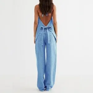 High-rise wide-leg jeans with matching halter-style vest (open back tie). Modern, elevated denim. Brand new, never worn (tags removed).