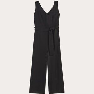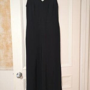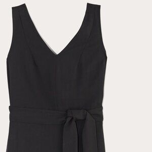 This piece features a sleeveless silhouette, deep V-neck in front and back, invisible zipper closure, belted waist with on seam pockets, and ankle length in triacetate.